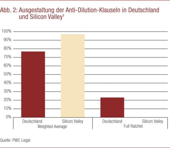 Studienergebnisse von Fenwick & West LLP zeigen, dass in den USA im betrachteten Zeitraum (nahezu) ausschließlich die gründerfreundlichere Weighted Average-Ausgestaltung der Verwässerungsschutzklausel Anwendung findet oder sogar ganz auf eine Verwässerungsschutzklausel verzichtet wird. Die investorenfreundliche Full Ratchet-Ausgestaltung des Verwässerungsschutzes wird nicht verwendet. Die Venture Capital-Studie zeigt für Investments in Deutschland dagegen ein heterogeneres Bild: Zwar vereinbaren die Teilnehmer zu circa 79% Anti-Dilution-Klauseln und verwenden davon überwiegend (55% Early Stage bis 68% Later Stage) die Weighted Average-Variante. Dennoch wird auch bei circa einem Viertel der Fälle die investorenfreundliche Full Ratchet-Klausel weiterhin vereinbart.