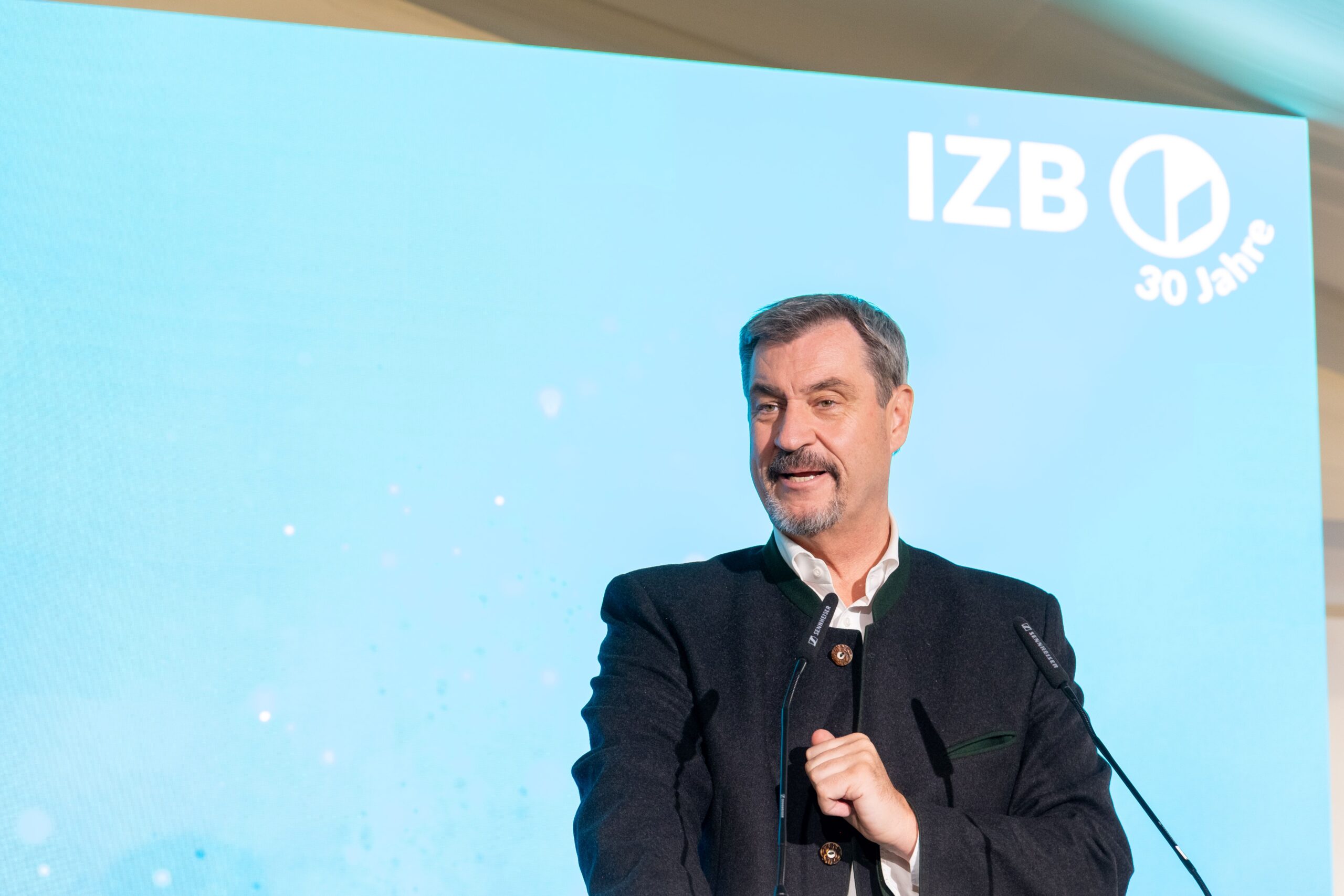 Rund 160 Gäste aus Politik, Wissenschaft, Wirtschaft und Medien kamen im Festzelt am Campus Martinsried zusammen! Im Rahmen eines offiziellen Festakts würdigte Bayerns Ministerpräsident Dr. Markus Söder in seinem Grußwort die Rolle des IZB als Impulsgeber für den Wissenschafts- und Wirtschaftsstandort Bayern. „Hightech hat in Bayern Heimat: Herzlichen Glückwunsch zum Jubiläum an das Innovations- und Gründerzentrum Biotechnologie in Planegg-Martinsried bei München. Hier unterstützt der Freistaat seit 30 Jahren junge Life-Science-Unternehmen. Biotech ist eine der herausragenden Zukunftsbranchen mit nahezu grenzenlosen Möglichkeiten durch KI und Quanten-Computing. Aus Ideen wird Realität, um Leben zu verbessern und zu verlängern. Mit unserem Ökosystem aus Wissenschaft, Forschung und Industrie treiben wir die Vernetzung entscheidend voran. Der Freistaat fördert das Zentrum seit der Gründung mit rund 75 Mio. Euro. Mit der Hightech Agenda investieren wir insgesamt sechs Mrd. Euro in die Zukunft für ganz Bayern – und wir entwickeln den neuen Life-Science-Campus der Max-Planck-Gesellschaft in Martinsried mit Investitionen von über 600 Mio. Euro. Damit laden wir Spitzenforscher aus der ganzen Welt nach Bayern ein. Danke allen Beteiligten und alles Gute für die Zukunft!“ Hermann Nafziger, Erster Bürgermeister der Gemeinde Planegg, hob in seinem Beitrag ebenso die Relevanz des IZB für die Entwicklung innovativer Therapien und Technologien hervor.