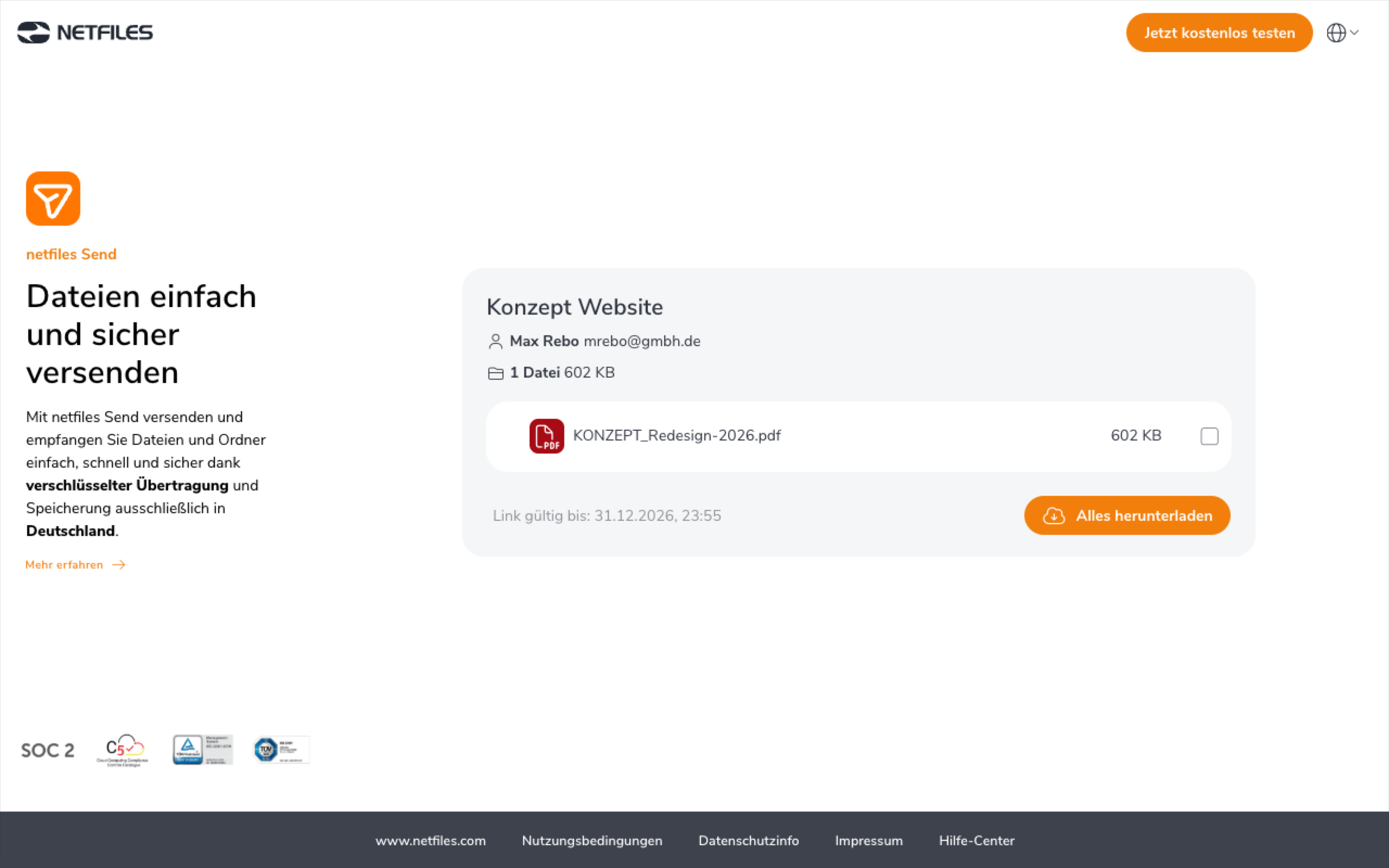 Empfänger erhalten Ihre Dateien ganz einfach: Ohne Konto, ohne Registrierung, ohne Hürden. (c) netfiles