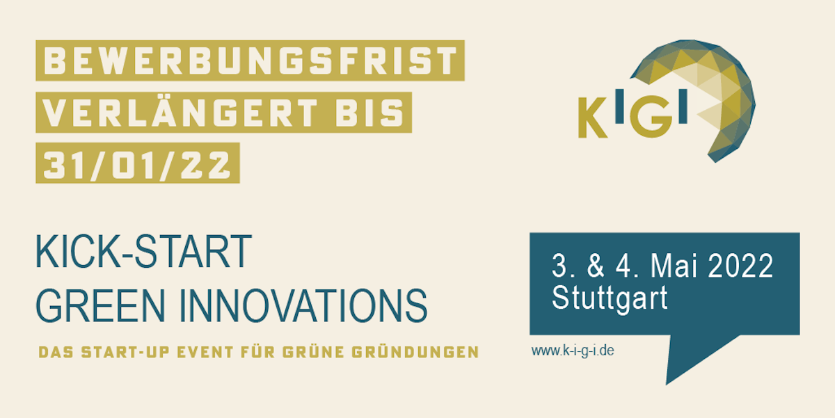Das Greentech Start-up Event Kick-Start Green Innovations – KIGI findet am 3. und 4. Mai 2022 statt. 25 frühphasige Start-ups der grünen Technologiebranchen aus dem deutschsprachigen Raum finden hier gezieltes Coaching, Branchenexpert*innen, Vernetzung und Preise. So sollen die Jungunternehmen vorangebracht werden. Die Bewerbungsfrist wurde verlängert: Grüne Start-ups können sich nun bis zum 31. Januar 2022 auf einen der 25 Teilnahmeplätze bewerben.